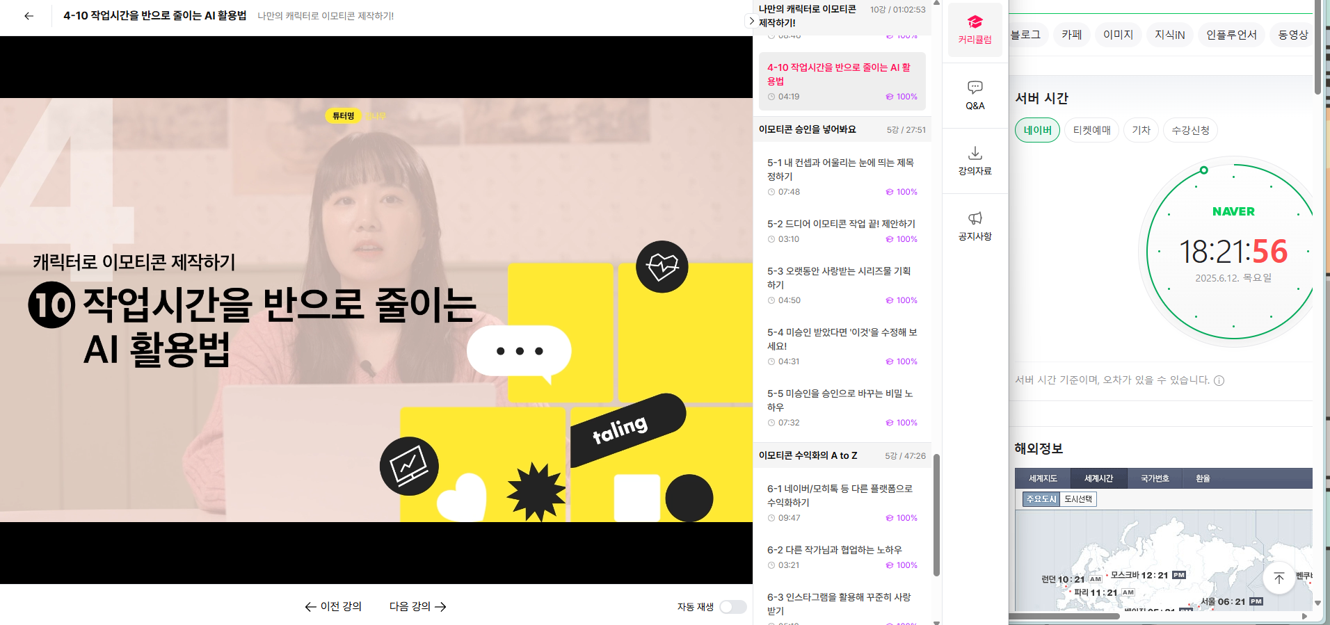 오늘은 클립 스튜디오를 활용한 아이패드 실습과 함께, 요즘 이모티콘 트렌드에 맞춘 AI 도구 소개까지 꽉 찬 강의를 들었어요. 4-9 강의에서는 직접 실습을 통해 아이패드에서 이모티콘을 그려보는 과정이 소개되었고, 4-10 강의에서는 생성형 AI와 자동 채색 툴 등을 활용한 최신 제작 방식이 정리되어 있었어요. 🙌