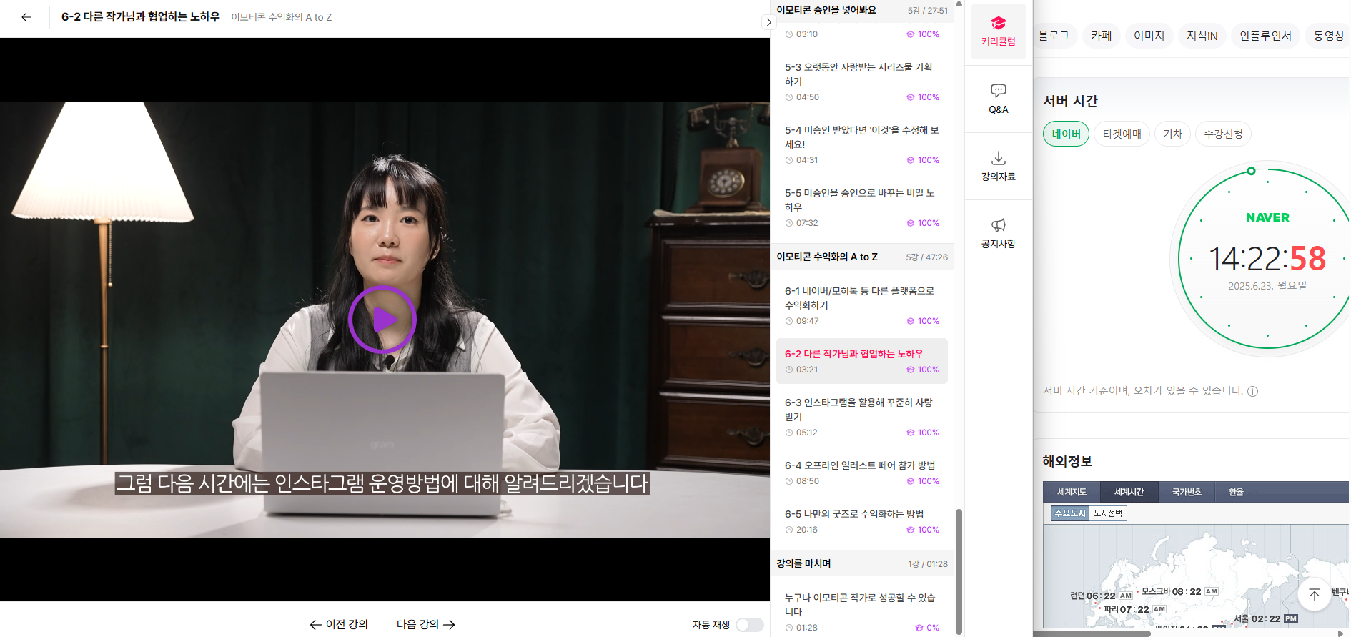 오늘 6-2강에서는 드디어 제가 기다리던 주제! 바로 “아티스트와의 협업으로 이모티콘 제작하기”에 대한 현실적인 이야기들이 나왔습니다. 그림을 못 그리더라도, **아이디어와 기획만으로도 이모티콘 작가가 될 수 있다**는 가능성이 정말 힘이 되었어요 😊